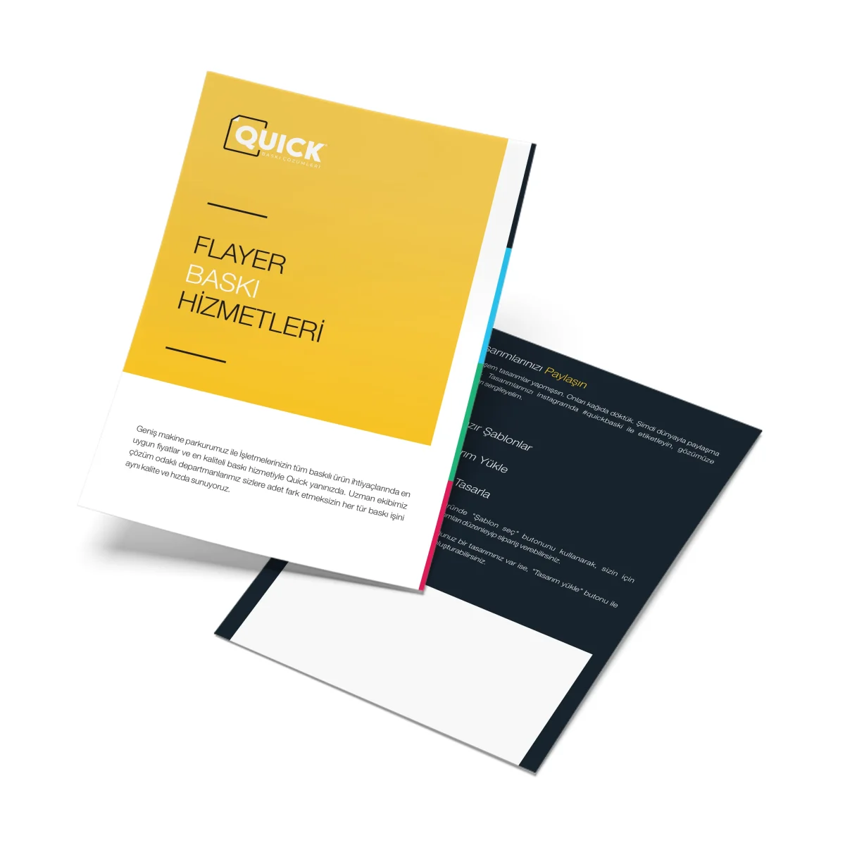 Her ürün için belirlenmiş şablonlar mevcuttur. Tasarımlarınızı bu şablonlar üzerinde hazırlamanız, baskı kayması, kesilme ve hizalama hatalarını önleyecektir. Şablonda belirtilen kesim payı (taşma/bleed), güvenli alan ve katlama çizgilerine mutlaka uyunuz. Güvenli alan dışına taşan metinler veya görseller baskı sonrası kesilebilir.