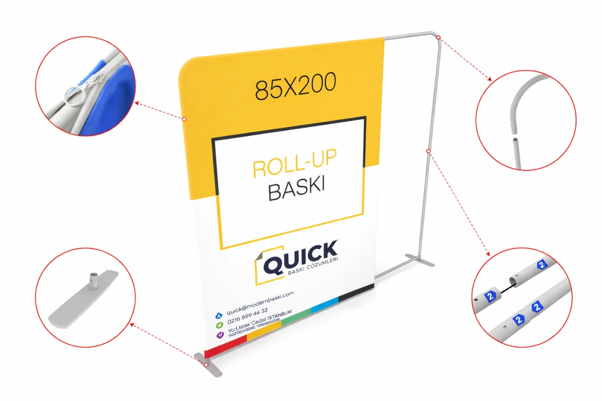 Çerçeve Malzemesi: Hafif alüminyum profil boru Baskı Yüzeyi: Strech kumaş — Dye Sublimation teknolojisi Baskı Kalitesi: Yüksek çözünürlük, canlı renk, UV dayanımlı Kurulum Süresi: 5-10 dakika (tek kişi, aletsiz) Taşıma Seti: Fermuar çantalı taşıma seti dahil Kullanım Alanı: İç ve dış mekan uyumlu Baskı Değişimi: Aynı iskelet üzerinde baskı değiştirilebilir Garanti: Çerçeve için 2 yıl mekanik garanti