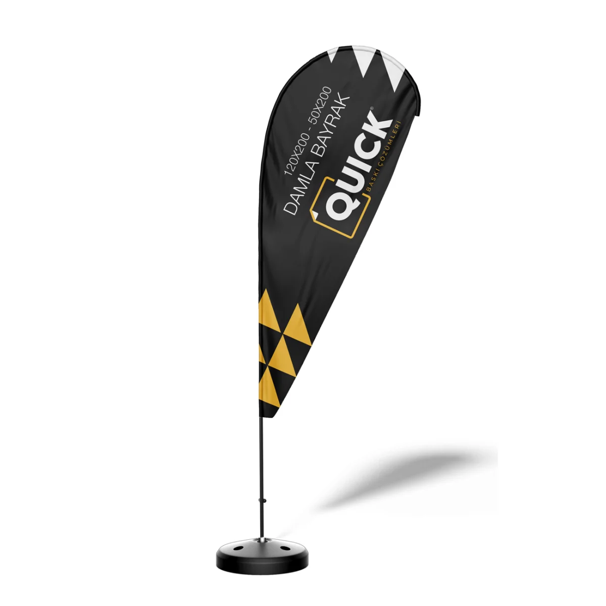 Damla formunun en büyük avantajı; rüzgarsız ortamlarda bile gergin ve düzgün duran yapısıdır. Bayrağın alt kısmındaki duba; kumaşı sürekli aşağı çekerek bayrağın her zaman açık ve okunabilir biçimde durmasını sağlar. Bu özellik özellikle plaj, otopark, mağaza girişi ve açık hava etkinliklerinde maksimum görünürlük açısından büyük avantaj sağlar.