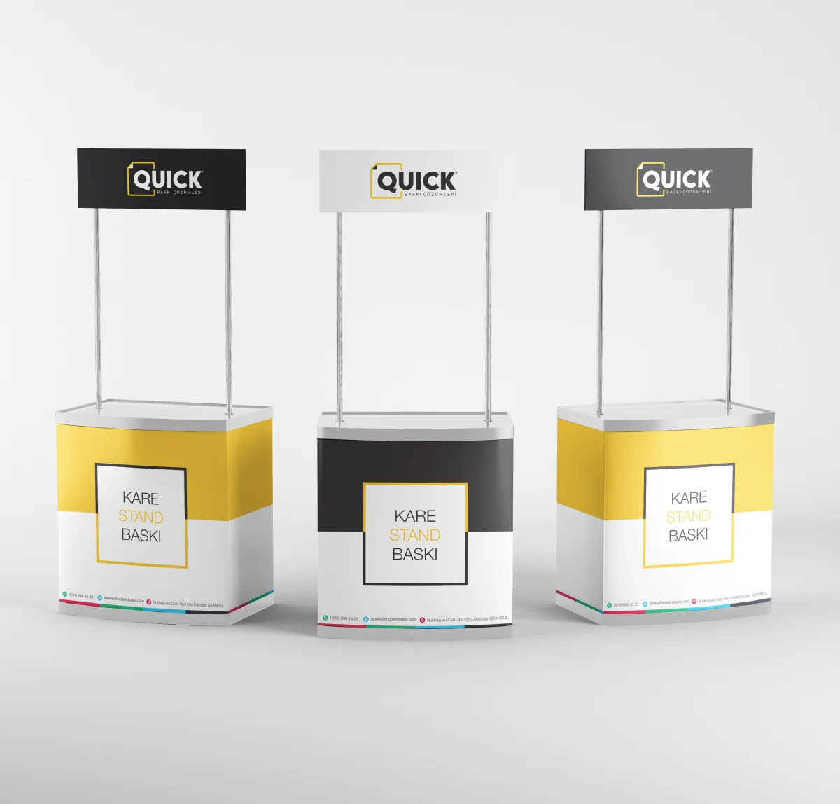 Kare reklam standları baskılı veya baskısız olarak tercih edilebilir. Dilerseniz tasarım dosyanızı göndererek baskılı sipariş verebilir, dilerseniz baskısız olarak satın alarak kendi görsellerinizi uygulayabilirsiniz.