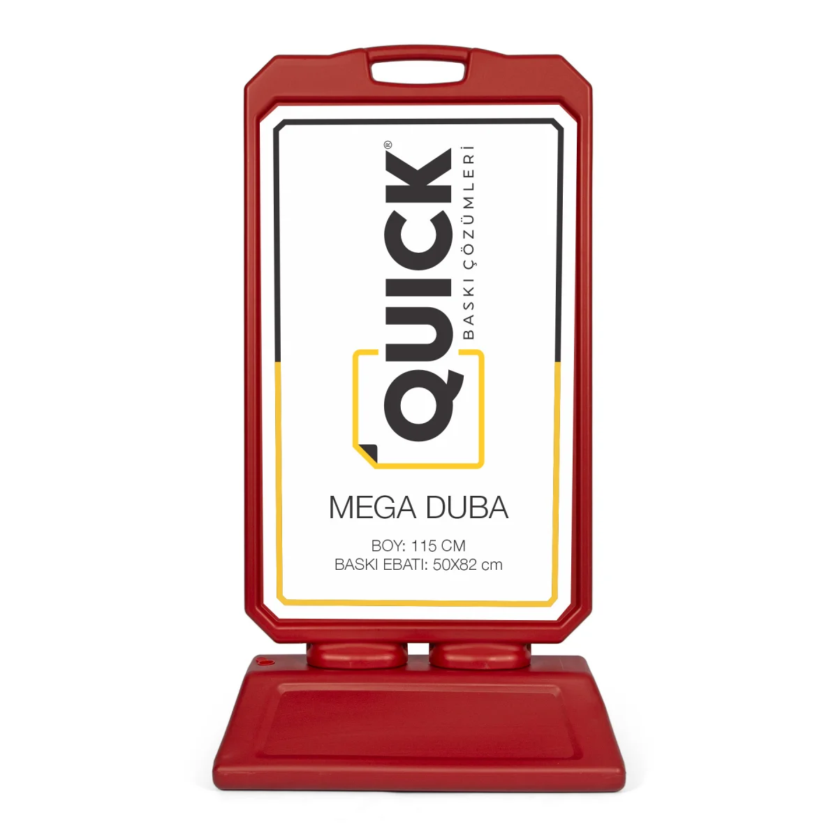 QuickBaskı olarak sunduğumuz Mega Park Dubası, sağlam plastik gövdesi sayesinde uzun süreli kullanıma uygundur. Ürünün toplam yüksekliği 115 cm olup büyük ve dikkat çekici bir reklam alanı oluşturur.