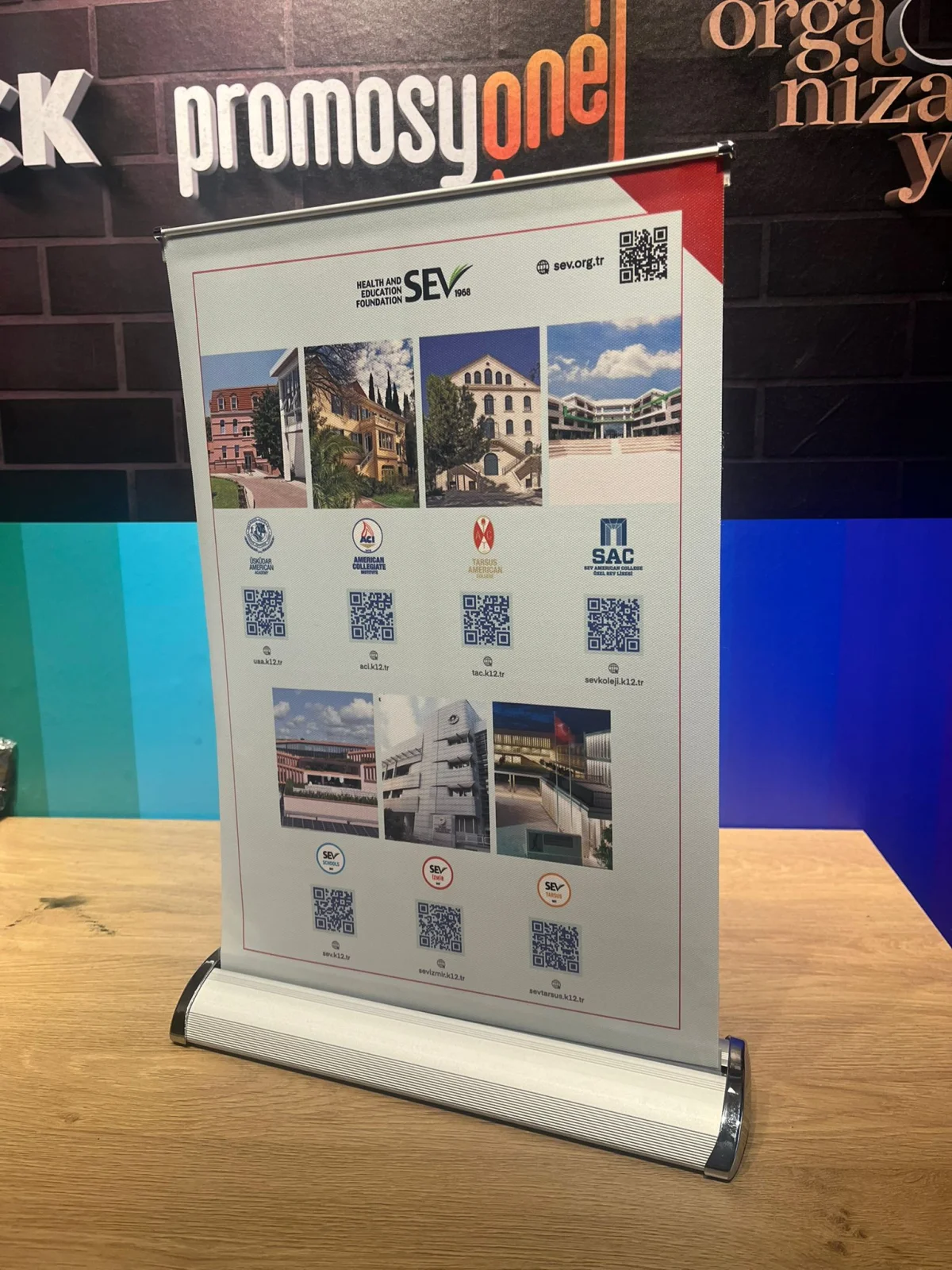 Mini Roll Up Banner, sınırlı alanlarda maksimum görünürlük sağlamak isteyen işletmeler için ideal çözümdür. Masaüstü, tezgah üzeri ve resepsiyon gibi küçük alanlarda kolayca kullanılabilen bu banner, UV baskı teknolojisi sayesinde canlı renkler ve uzun ömürlü baskı kalitesi sunar. A4 ve A3 boyut seçenekleriyle her ihtiyaca uygun çözüm sağlar.