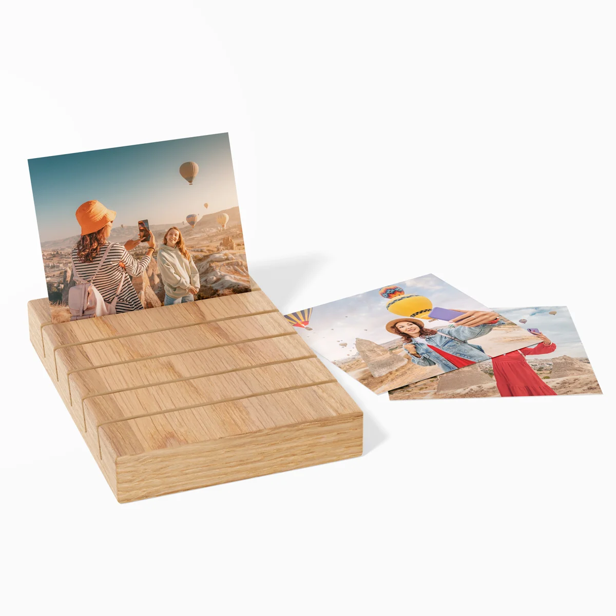 5'li ahşap stand seçeneği; metal foto magnetlerinizi buzdolabına yapıştırmak yerine masa, raf veya çalışma köşenizde dekoratif biçimde sergilemenizi sağlar. Doğal ahşabın sıcak dokusu ile metalin parlak ve modern yüzeyinin buluşması; son derece estetik ve dikkat çekici bir sergileme deneyimi sunar.