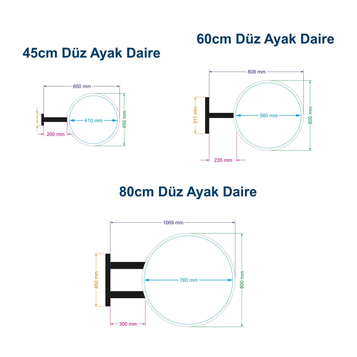 45 cm, 60 cm ve 80 cm çap seçenekleriyle sunulan fener tabelalarımız; işyerinizin büyüklüğüne ve tabela alanınıza göre en uygun boyutu seçme imkânı sunar. UV baskı teknolojisi sayesinde logo, yazı ve kurumsal görseller son derece canlı, keskin ve uzun ömürlü biçimde yüzeye aktarılır. Düz ayaklı tasarımı sayesinde zemine sabit biçimde yerleştirilebilir; duvara montaj gerektirmeden mağaza girişi, kaldırım kenarı veya vitrin önünde kolaylıkla konumlandırılabilir.