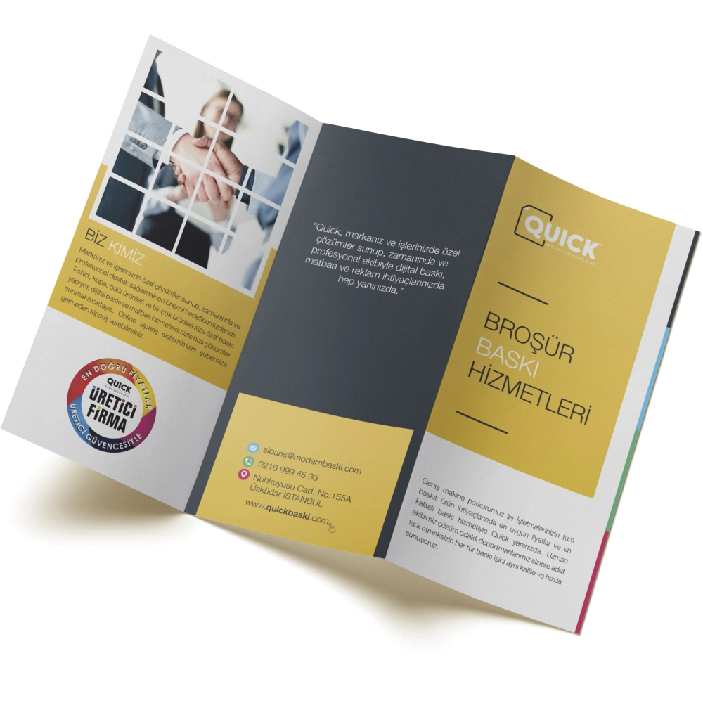 2 kırım broşür, tek bir kağıdın iki yerinden katlanmasıyla oluşturulan, toplamda 6 yüzeye sahip bir tanıtım materyalidir. Bu katlama şekli, broşürün içeriğini düzenli ve sıralı bir şekilde sunma imkanı tanır.